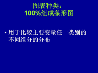 100%组成条形图是一个变量的堆积条形图。为了更易于解释,使每一条高度相同,而其组分则以总数的百分率而非实际值显示。