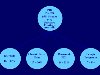 women of reproductive age. Surveillance data are sparse, but suggest that approximately 8% of U.S. women and 15% of Swedish women are diagnosed with PID in their lifetime, with over one million women treated annually in the U.S. Rates of PID are much higher in developing countries and have been reported to be as high as 32% among Indigenous women in a remote community in the Northern Territory of Australia. Acute PID may lead to major reproductive and gynecologic morbidity including infertility, CPP, recurrent PID, and ectopic pregnancy. |