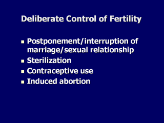 by - Reducing the effective reproductive span through postponement of marriage or interrupted marriage - Sterilization that ends reproductive capacity early (ex. Vasectomy, tubal ligation) - By using contraceptives - Or by induced abortion |