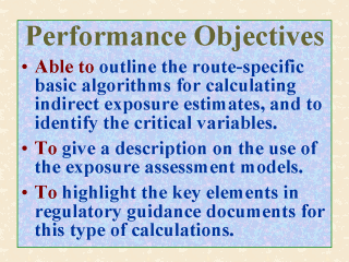etc. In addition, students are expected to be capable of giving a brief description on the applications and principles of the exposure assessment computer models discussed in this lecture. While they each represent years of efforts by the human exposure assessment (HEA) community, these computer models have been developed primarily to facilitate the numerous complex calculations involved. Students should be able to explain why the calculations in the indirect measurement methods (IMM) approach are numerous and complex, and why such calculations would give only indirect estimates of human exposures to environmental contaminants. Finally, students should be able to identify the key elements that regulatory agencies have specified in their guidance documents on IMM used in HEA. For lack of space, this lecture will only give a very brief discussion on these guidance documents. |