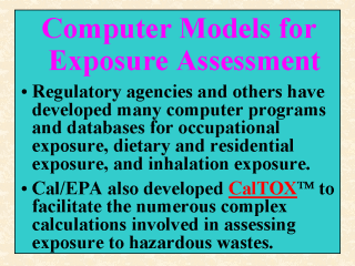 regulatory concern. The Love Canal environmental disaster led to a great deal of legislation in the United States during the 1970s regarding hazardous wastes and chemical dump sites. The Comprehensive Environmental Response, Compensation and Liability Act, otherwise known as Superfund, was apparently passed to provide direction and financial support for the clean-ups of hazardous wastes. To facilitate the health risk assessments required for this type of toxic substances, California Environmental Protection Agency (Cal/EPA, 1997) has developed a spreadsheet model that can systematically process the numerous complex exposure calculations involved. This model, known as CalTOX (tm) , was built upon the laws of mass conservation and chemical equilibrium which together constraint the way a chemical can move in the media. CalTOX first determines the time-dependent chemical concentrations in four exposure media (air in the breathing zone, drinking water, food, and soil) from 8 environmental compartments: air; ground water; surface water; plants; sediment; and 3 soil layers). It then uses the equations given in the federal Risk Assessment Guidance for Superfund (U.S. EPA, 1989) to estimate the exposures and risk. CalTOX has the capability of conducting Monte Carlo simulations, which as defined earlier (Slide 18) is a probabilistic analysis. |
