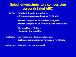 funcionamiento y la calidad de vida de adultos mayores. En Abril de 1997, la fuerza de reclutar más de 3000 participantes en el estudio de Salud ABC inició. La población del estudio fue diseñada para incluir números comparables de negros y blancos debido a que esos grupos difieren en ciertos aspectos de la composición corporal y en la prevalencia de condiciones de salud relacionadas al peso. Se determinó que la comparación de los dos grupos debería ayudar a identificar factores de riesgo de discapacidades importantes tales como osteoartritis y enfermedad pulmonar. También permitirá la determinación del grado en el cual la diferencia reportada en sobrevida y discapacidad entre negros y blancos es secundaria a esos resultados secundarios de la salud. El primer año del examen fue dedicado principalmente a evaluaciones clínicas iniciales y a evaluar la prevalencia de condiciones de salud relacionadas al peso, incluyendo osteoporosis, osteoartrtitis, función pulmonar, enfermedad cardiovascular, depresión, diabetes, y cánceres seleccionados. Al progresar el estudio, dos o tres estudios detallados se enfocarán en factores hipotetizados para acelerar cambios en la composición corporal, particularmente la pérdida de hueso y de masa muscular. También habrá un estudio de vitalidad cognitiva enfocándose en individuos altamente funcionales en la cohorte. |