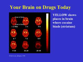 where cocaine binds (yellow signal) and for how long. Such studies teach