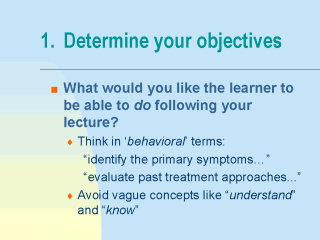 this sentence, concentrating on a verb that indicates an observable behavior. "The learner will..." Establishing your objectives ahead of time helps you focus and plan the lecture, increasing the likelihood that your intended learning outcomes will be accomplished. Compare the following introductions to a lecture: 1. Today, we are going to talk about the different approaches to treating chronic ear infections. 2. Given a case history involving chronic ear infections, you will compare and contrast treatment approaches to determine the likelihood of success. Can you see how the second introduction, based on the objective to compare and contrast, is more specific in its expectations for the learner? This particular objective sets up an inherent framework for the body of your lecture by investigating similarities and differences of treatments within the context of a case. |