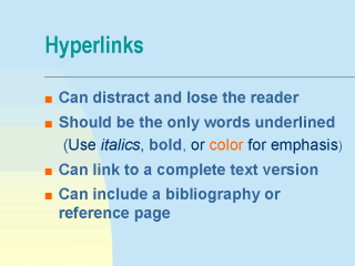 farther and farther from your site. Users are familiar with the convention of underlined hyperlinks; therefore select a device (e.g., bold, italics) other than underlining to emphasize important words. A hyperlink to a full text version of your lecture on a single web site can offer access to a version that can be hard copied. This is a little more work, but increases the usability and accessibility of your lecture to a wider audience. Also, a hyperlink can used as a link to a webpage of references or a bibliography for further information. This is another feature that users would find helpful at the end of your lecture, particularly if the links are to other websites. |