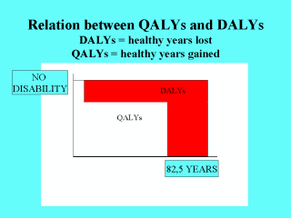 life lived - DALYs are years of healthy life lost. Whereas DALYs represent a loss and should be minimised, QALYs represent a gain and should be maximised. In the DALY approach, the years are disability weighted on a scale from zero, which indicates perfect health (no disability), to one, which indicates death. In the QALY approach, the scale goes the opposite way: A quality weighting (sometimes called "utility") of 1 indicates perfect health, whereas 0 indicates no quality of life, and is synonymous to death. ( Age weighting and discounting factors are not included in this illustration). |