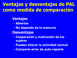 correlacionados. - Las principales fuentes de error asociados con cuestionarios son debidos a la restringida lista de actividades, memoria, y malinterpretación de las preguntas. Estas fuentes de error son compartidas, típicamente, por Pal que son abiertas y no dependen de la memoria (las actividades son registradas conforme ocurren). - Desventajas de PAL involucran el hecho de que dependen fuertemente de la motivación del sujeto – y consumen mucho tiempo para completarse. Completándolas dan lugar a mayor conciencia alterando la actividad habitual. PAL también comparten errores con los cuestionarios de auto-reporte. Por ejemplo, los sujetos están proclives, con frecuencia, a sobreestimar su actividad. |