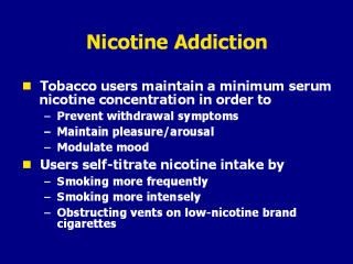As shown in the previous slide, tobacco users tend to carefully titrate, or regulate, their tobacco intake to maintain a relatively constant level of nicotine in the body, in order to