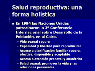 Población patrocinada por NU. Mientras que los dos encuentros anteriores se enfocaron en planificación familiar, el reporte de este tercer encuentro aconsejó una forma más holística, en el cual la salud reproductiva fue definida como “el estado de bien estar físico, mental y social, y no solo la ausencia de enfermedad”. Específicamente, el Programa de Acción aconsejó: Sexo seguro; La capacidad de reproducirse y la libertad para tomar decisiones reproductivas; Y educación y acceso a planificación familiar, segura, efectiva, aceptable y proporcionada; Por último, también señaló que el estimular a las relaciones interpersonales, fuera de la atención reproductiva y de Enfermedades de Transmisión Sexual, es parte de la salud reproductiva. |