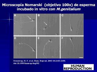 EPI está asociada con morbilidad reproductiva. Dado el hecho de que M. genitalium está asociado con EPI, es posible que M. genitalium pueda también estar asociado con infertilidad. Unas líneas de evidencia apoyan esta posibilidad. Primero, M. genitalium ha sido encontrado adherido al esperma humano in vitro, y esto podría permitir que M. genitalium sea llevado al tracto femenino superior en el esperma móvil. |
