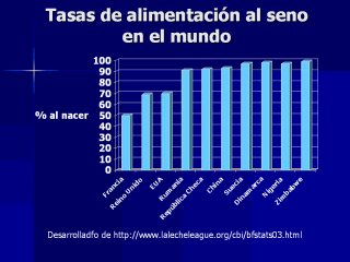 por 2 años, pero las tasas varían en cada país. Las tasas más elevadas están en África sub-sahara y demuestran qu7e la importancia de la alimentación al seno tiene en control de la fertilidad así como en la salud infantil y materna, ya que el uso de anticonceptivos es baja en esta región. Las tasas de alimentación al seno materno son altas en países escandinavos, y podríamos hipotetizar que atención en salud apoyada por el estado, long paid maternity leaves, y aceptación social de la alimentación al seno pública están entre los factores más impactantes. En contraste, las tasas más bajas de alimentación al seno se encuentran en Francia, el Reino unido y los Estados Unidos. No solo las tasas de alimentación al seno al nacer son más bajas en esos países, sino que la tasas de alimentación al seno cae al 20% a los 6 meses en los EUA. |