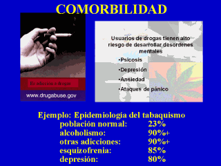 | Co-morbilidades de enfermedades mentales es común entre los usuarios de drogas, incluyendo fumadores, con tasas más elevadas que en la población normal. La co-ocurrencia de otras adicciones a drogas es también mucho más alta. Usuarios de drogas también tienen alto riesgo de desarrollar desórdenes mentales, aunque el orden de esos eventos puede ser difícil de determinar precisamente. |