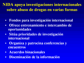 | El programa internacional de NIDA logra significativas contribuciones a la investigación sobre el abuso de drogas. Estas incluyen fondos y entrenamiento, situando prioridades, patrocinio de conferencias e diseminación de la información. |