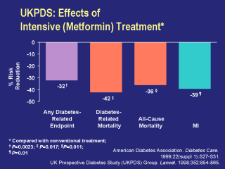 342 were randomized to intensive therapy with metformin. Patients in whom glycemic goals were not met with intensive monotherapy received combination therapy. In sulfonylurea-treated patients either metformin or insulin was added and in metformin-treated patients a sulfonylurea was added; if the glycemic goal was still not met, insulin was substituted for the sulfonylurea. The aggregate endpoints for metformin-treated patients were: any diabetes-related clinical endpoint (sudden death, death from hyperglycemia or hypoglycemia, fatal or nonfatal MI, angina, heart failure, stroke, renal failure, amputation of at least one digit, vitreous hemorrhage, retinopathy requiring photocoagulation, blindness in an eye, or cataract extraction) diabetes-related mortality (death from MI, stroke, PVD, renal disease, hyperglycemia or hypoglycemia, or sudden death) all-cause mortality. To determine the effect of intensive treatment on vascular disease, secondary outcomes analysis included: MI (both fatal and nonfatal and sudden death) stroke (both fatal and nonfatal) amputation of at least one digit or death from PVD microvascular complications (retinopathy necessitating photocoagulation, vitreous hemorrhage, fatal and nonfatal renal failure). Intensive metformin therapy significantly reduced any diabetes-related endpoint by 32% (P=0.0023); diabetes-related mortality by 42% (P=0.017); all-cause mortality by 36% (P=0.011); and MI by 39% (P=0.01). UK Prospective Diabetes Study (UKPDS) Group. Lancet. 1998;352:854-865. American Diabetes Association. Diabetes Care. 1999;22(suppl 1):S27-S31. |