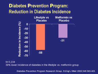 CI, 17%-43%). The incidence of diabetes was 39% lower (95% CI, 24%-51%) in the lifestyle group than in the metformin group. Treatment effects did not differ significantly according to sex or to race or ethnic group. The lifestyle intervention was highly effective in all subgroups. Its effect was significantly greater among persons with lower base-line glucose concentrations two hours after a glucose load than among those with higher base-line glucose values. The advantage of lifestyle intervention over metformin was greater in older persons and those with a lower body-mass-index than in younger persons and those with a higher body-mass-index. The effect of metformin was less with a lower body-mass-index or a lower fasting glucose concentration than with higher values for those variables. The investigators concluded that, compared with placebo, 1 case of diabetes can be prevented for every 7 persons treated with lifestyle changes for 3 years and for every 14 persons treated with metformin for 3 years. Diabetes Prevention Program Research Group. N Engl J Med. 2002;346:393-403. |