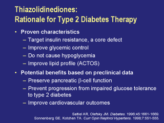 glycemic control without causing hypoglycemia. ACTOS has demonstrated improvement in lipid profiles in patients with diabetes who are treated with these agents. Potential benefits of thiazolidinedione treatment, which have been suggested in preclinical studies, include further improvements in the cardiovascular risk profile (endothelial cell function, smooth muscle reactivity and effects on the fibrinolytic pathway) and preservation of pancreatic beta-cell function. This latter effect has prompted the use of thiazolidinediones in several studies of the prevention of progression of impaired glucose tolerance to type 2 diabetes. Saltiel AR, Olefsky JM. Diabetes. 1996;45:1661-1669. Sonnenberg GE, Kotchen TA. Curr Opin Nephrol Hypertens. 1998;7:551-555. |