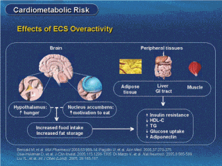 obesity. CB1-R stimulation leads to dopamine release in the nucleus accumbens shell, which increases motivation to eat. These effects result in increased food intake and fat accumulation. In the peripheral arena, ECS overactivation promotes lipogenesis at the level of adipose tissue and the liver. ECS activity in the GI tract interferes with feelings of satiety, and CB1-R stimulation of skeletal muscle decreases glucose uptake. All of these central and peripheral effects contribute to the increased risk of dyslipidemia, insulin resistance, glucose intolerance and increased cardiometabolic risk. Bensaid M, Gary-Bobo M, Esclangon A, et al. The cannabinoid CB1 receptor antagonist SR141716 increases Acrp30 mRNA expression in adipose tissue of obese fa/fa rats and in cultured adipocyte cells. Mol Pharmacol. 2003;63:908-914. Pagotto U, Vicennati V, Pasquali R. The endocannabinoid system and the treatment of obesity. Ann Med. 2005;37:270-275. Osei-Hyiaman D, DePetrillo M, Pacher P, et al. Endocannabinoid activation at hepatic CB1 receptors stimulates fatty acid synthesis and contributes to diet-induced obesity. J Clin Invest. 2005;115:1298-1305. Di Marzo V, Matias I. Endocannabinoid control of food intake and energy balance. Nat Neurosci. 2005;8: 585-589. Liu YL, Connoley IP, Wilson CA, Stock MJ. Effects of the cannabinoid CB1 receptor antagonist SR141716 on oxygen consumption and soleus muscle glucose uptake in Lep(ob)/Lep(ob) mice. Int J Obes (Lond). 2005;29:183-187. |