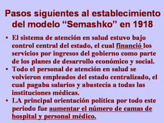 | Para 1941, cuando Rusia entró en la Segunda Guerra Mundial, el sistema de atención en salud estaba bien desarrollado y tuvo éxito en traer servicios confiables de atención en salud a toda la población. |