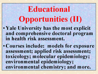 Exposures to Environmental Stressors). At the Yale University, the doctoral students in EHS are especially "trained to identify potentially adverse environmental agents, assess their exposures, determine their impact on health, and estimate the consequent risk." Courses offered at the EHS include: Environmental Epidemiology; Environmental Toxicology; Fundamentals of Environmental and Health Risk Assessment; Applied Risk Assessments I and II; Environmental Chemistry; Principles of Epidemiology II; Models for Assessing Exposure to Environmental Contaminants; Environmental Measurement; Occupational Epidemiology; Introduction to Laboratory Techniques in Molecular Epidemiology; Risk Communication; and more. Those doctoral and masters degree students in EHS with a minor or an interest in environmental health policy may elect such courses as Science and Politics of Environmental Regulation, and Environmental Protection Clinic, both of which are offered at the Yale School of Forestry and Environmental Sciences. |