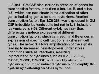 (44). Other cytokines which may also participate in the network include interferons α/ β and g and IL-4, IL-10, and IL-13. These cytokines can exert negative effects on the responsiveness of hematopoietic myeloid cells to certain CSFs and on the production of these cytokines (45-47). |