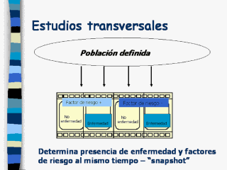 Otro diseño comúnmente utilizado en epidemiología es un estudio transversal. Con este diseño, la evaluación de enfermedad y de factores de riesgo son realizados al mismo tiempo. Esto nos da un “vistazo” de la prevalencia de la enfermedad y potenciales factores de riesgo en una comunidad en un tiempo en particular.