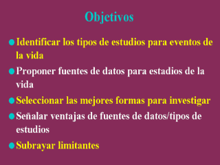 Al terminar esta conferencia, los lectores estarán en posición de identificar tipos de estudios apropiados para examinar varios eventos de la vida, sobre las bases del propósito del estudio, disponibilidad de datos y otras limitantes no técnicas.