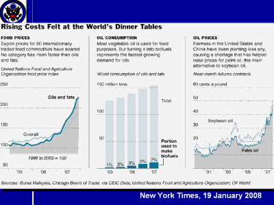 Monday.” Josette Sheeran, Executive Director of the World Food Program is quoted thus: “We’re concerned that we are facing the perfect storm for the world’s hungry.” She said that her agency’s food procurement costs had gone up 50 percent in the last five years and that some poor people were being “priced out of the food market.” The head of the UN Food and Agriculture Organization was quoted as suggesting that: “…all countries and international agencies would have to “revisit” agricultural and aid policies they had adopted “in a different economic environment.” For example, with food and oil prices approaching records, it may not make sense to send food aid to poorer countries…...” End quote. The spike in food prices is also not so good for tropical forests. |