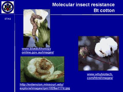 There is little doubt that contemporary molecular methods are needed to achieve the kinds of dramatic increases in productivity required to meet the growing demand for food and biofuels. I remind you that increases in farm land today are largely bought at the cost of our ever shrinking wildlands, particularly in the tropics, where every acre lost takes into extinction species we’ve not yet even identified. We have the requisite molecular tools: they’ve been used to introduce genes that confer insect resistance and herbicide tolerance on crop plants. Here is one of the insects that attacks cotton and the damage it does -- and here is Bt cotton*, cotton containing a bacterial gene encoding a protein that is toxic to insects, but not people. |