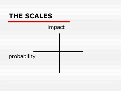 | On the scale, impact increases from 0 to 10 as you move up the vertical scale. Probability increases from 0.0 to 1.0 as you move from left to right on the horizontal scale. The mid point is thus the intersection of impact 5 and probability 0.5. |