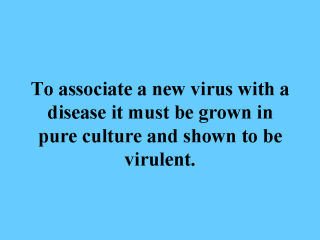 postulates: 1) The virus must be present in every case of the disease. 2) The virus must be grown in-vitro in living cells. 3) The disease must be reproduced when a pure culture of the virus is inoculated into a healthy susceptible host. 4) The virus must be recovered again from the experimentally-infected host. |