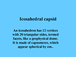 | There are 12 penton capsomeres, one at each vertex. A penton is not just a single ball-shaped molecule but always contains 5 copies of each capsid protein. It has 5 neighbouring capsomeres. There are a variable number of hexon capsomeres on each facets, depending on the size of the virus e.g. FMDV has none and adenoviruses have 20 x 12 = 240 hexons. A hexon has 6 copies of each capsid protein(s) with 6 neighbours. The number of different capsid proteins varies from 1 to 6 eg VP1-4 for FMDV. |