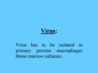 and clinical signs in domestic pigs: - Virus infects via the upper respiratory tract, or skin from ticks, and enters the bloodstream in monocytes to reach the viscera and bone marrow in a few days. The virus binds to rbcs to cause haemolysis. The virus also infects helper T cells such that cytokines for B-cell differentiation are missing and the B cells undergo apoptosis. - Acute viruses (Africa): -Clinical signs are respiratory discharges and diarrhoea. Reddened areas sometimes appear on the skin. Death is typically within 7 days of symptoms. - At post mortem, large internal widespread haemorrhages. - Subacute viruses (Europe): Haemorrhages and splenomegaly are less marked than with the acute viruses and petechial haemorrhages may be seen under the kidney capsule. Mortality of up to 30-70%. Some survivors become emaciated with skin ulcers and joint swellings. Other survivors become clinically normal but still act as carriers for several months. |