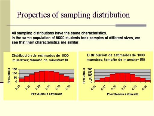 The averages of distributions is 30%, which is the true value of the population. The ranges of values vary somewhat, finding more extreme values when the sample size is smaller. The larger the sample size, the more similar the sampling distribution with Normal distribution. |