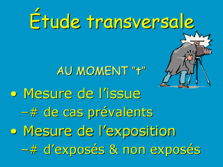 Définition:  étude de prévalence où l'exposition et l'issue sont mesurées à un moment précis dans le temps.  Un nombre n d‘individus sont échantillonnés parmi la population cible au temps "t" et classés selon la présence/absence de l'issue et la présence/absence de l'exposition.  On prend en quelque sorte une photographie de l'état de la population face à l'issue et à l'exposition à un moment t.