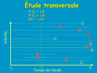 Avec une approche transversale, si on mène notre enquête au moment t, on trouvera un rapport des prévalences égale à 1,00. En effet, on regarde qui est exposé ou non au temps t ainsi que le statut de la maladie. On obtient que la prévalence de la maladie est la même parmi les exposés et les non exposés.