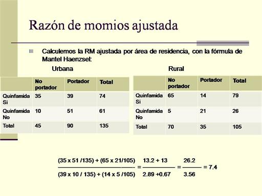 La RM cruda es de 8.89; en área urbana es de 4.58 y en área rural de 19.5. Aunque en ambas áreas de residencia se modificó la RM, sigue siendo estadísticamente significativo. La RM de Mantel Haenzsel es de 7.4 lo cual significa que área de residencia es un confusor para la asociación de quinfamida y no ser portador de E. histolytica.