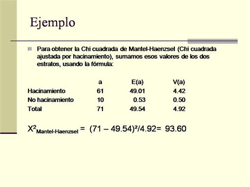 Así, después de ajustar por el efecto de hacinamiento, la Chi cuadrada se ha reducido de 111.88 a 93.6. El valor de p que corresponde a ese valor es P < 0.0001. La asociación entre asistencia a la guardería e infección respiratoria es altamente significativa, aún después de ajustar por la variable confusora de hacinamiento. |