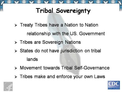 - Treaty Tribes have a Nation to Nation relationship with the U.S. government that was established by treaties or federal recognition. -Tribes are sovereign Nations that exist through treaties. Each tribe has it’s own government and constitution, with a unique legislative process. -States do not have jurisdiction on tribal lands. In fact, states and Tribal governments are often in legal conflict over Tribal treaty rights. -Through U.S. Congressional policy there is movement towards Tribal self-governance. This means the U.S. government is allowing tribes to manage their own destiny- run their own programs, such a health programs