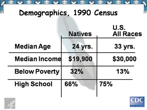 A few demographics on Natives. Natives have a median age of 24 years compared to 33 years for all U.S. Races. The median household income is $19, 900 compared to $30,000. Thirty-two percent of the native population live below poverty compared to thirteen percent of the total population. Sixty-six percent of Native completed High School compared with 75 percent of the total population.* A few additional facts: Three of the ten poorest counties in the U.S. are located within a reservation, and unemployment rates on reservations range from 25 to 85 percent.