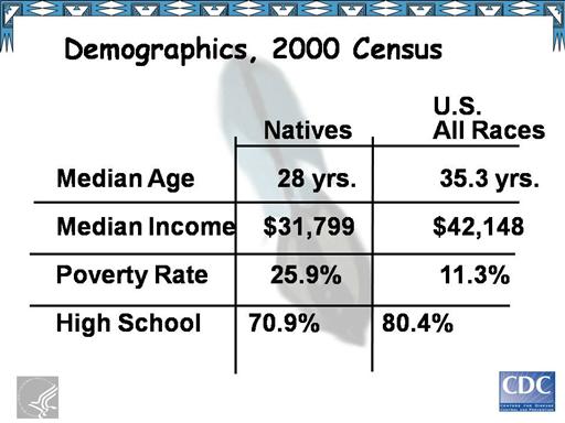 Go to Part II of this lecture. A few demographics on Natives. Natives have a median age of 24 years compared to 33 years for all U.S. Races. The median household income is $19, 900 compared to $30,000. Thirty-two percent of the native population live below poverty compared to thirteen percent of the total population. Sixty-six percent of Native completed High School compared with 75 percent of the total population.* A few additional facts: Three of the ten poorest counties in the U.S. are located within a reservation, and unemployment rates on reservations range from 25 to 85 percent. * 1990