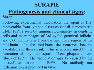 incubation period . - Sheep first appear hyperexcitable with an erect head and high-stepping gait. - Sheep make lip movements when their back is scratched. - Later on muscle tremors, bilateral intense pruritis or stupor and finally ataxia may develop with accompanying anorexia and emaciation. - dd, ectoparasites, (Maedi-Visna, Louping ill and pregnancy toxaemia) - Deaths are most frequent at 2-5 years of age and up to 10% of the flock may die in an endemic area. Mink, from sheep offal with further spread by biting (mink encephalopathy) |