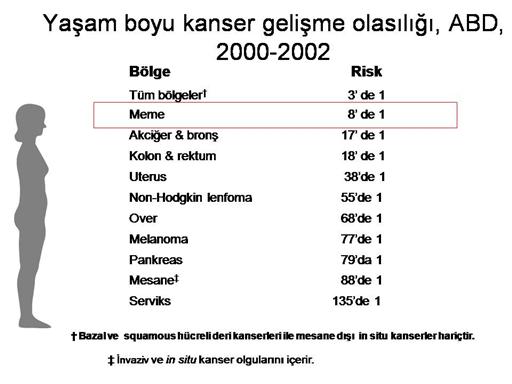 Şu anda 2,278,269 (%40kadın; %23 genel)kadın meme kanseri öyküsü ile yaşıyor.(Ocak, 2002,ABD)