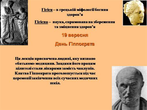 Стисла біографія Гіппократа Гіппократ, (460-377? до н.е.), видатний грецький медик. Нам небагато відомо про його життя. Відомо лише, що він був лікарем на острові Кос, що мешкав у найбільш інтелектуальний період Стародавньої Греції та був вільний від забобонів. Більше вісімдесяти трактатів було приписано Гіппократу; однак сьогодні вважається, що деякі з них були написані іншими людьми, які скористалися його ім’ям і репутацією. Праці Гіппократа являють собою десять томів енциклопедії медицини і хірургії. Його називають батьком наукової медицини. Він не вірив у міфічні хвороби або виліковування. Він вчив, що правильна дієта – потреба організму, і що клімат має глибокий вплив на здоров’я людей. Він помер у Сессалії в поважному віці. http://www.sacklunch.net/biography/H/Hippocrates.html 19-го вересня в Греції відзначають як День Гіппократа. Ми пропонуємо відзначати День Гіппоката в усьому світі як всесвітній День Профілактики, день, коли світова медична громадськість зможе об’єднатися. 19-го вересня 2009 ми б хотіли звернутися до медичних концепцій Гіппократа і профілактичних концепцій грецької богині здоров’я Гігеї. Гігея являє собою божество гарного здоров’я як дочка бога Асклепіоса і Афродіти. "Союз" Гіппократа і Гігеї може также представляти собою дві форми енергії – Янь та Інь. Для додаткової інформації про Гіппократа відвідайте http://www.allsands.com/Science/hippocratesbiog_rtb_gn.htm |