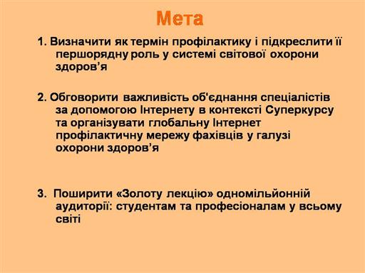 “Обмінюйтеся знаннями!” Ми б хотіли представити цю лекцію 1 000 000 людей в усьому світі. Вільно розсилайте лекцію всім, кому можете, і, будь ласка, повідомте нам, хто її вже отримав. Якщо у Вас є міркування з приводу каналів поширення цієї лекції, повідомте нам (super2@pitt.edu ). Щоб приєднатися до Суперкурсу, будь ласка, відвідайте www.pitt.edu/~super1 або електронну пошту super2@pitt.edu . Членство в Суперкурсі дозволить Вам отримувати компакт-диски Суперкурсу, JIT(«своєчасні») лекції та щорічні лекції з профілактики.