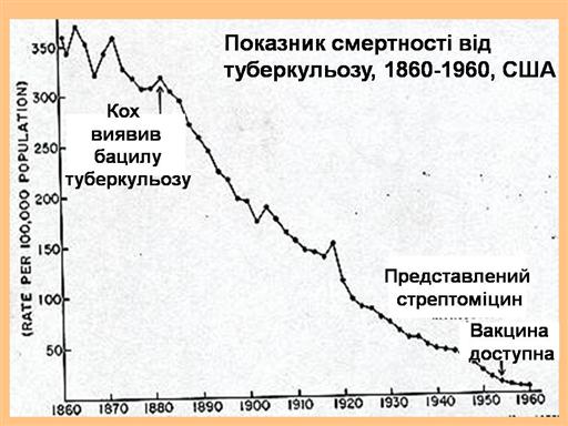 Автор: Джон Ласт, Канада http://www.pitt.edu/~super1/lecture/lec2561/007.htm Показник смертності від туберкульозу, 1860-1960, Сполучені Штати, Джерело: Американське Бюро Перепису, Історична Статистика Сполучених Штатів; З колоніальних часів до 1970 (Вашингтон, D.C.: Державний Офіс Преси, 1975), Частина 1, сторінки 58-63. Зверніть увагу: Дані наведені для 1860 і 1900 років тільки для Штату Массачусетс.