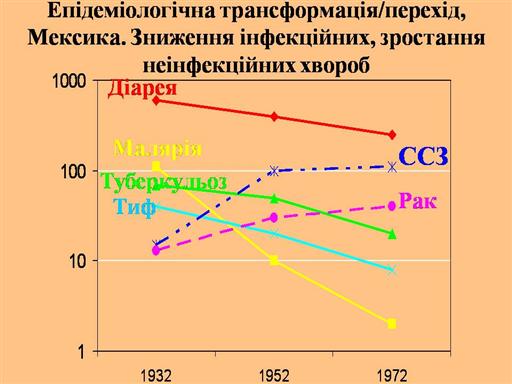 Епідеміологічна трансформація/перехід не обмежується розвиненими країнами. Епідеміологічна трансформація/перехід також може спостерігатися в країнах, подібних до Мексики. Епідеміологічна трансформація/перехід була чітко відзначена в більшості країн у минулому столітті. Так, у Мексиці майже всі інфекційні хвороби зменшилися, а, отже, тривалість життя підвищилася, і проявилися серцево-судинні захворювання. Це демонструє розвиток хвороб на популяційній основі. |