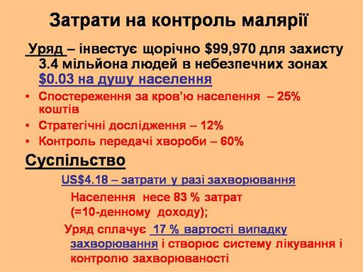 Контроль малярії – серйозна робота для професіоналів у галузі охорони здоров’я в області Хенан Китаю. Представлений слайд показує, що в цьому специфічному прикладі вартість хвороби більше ніж у 100 разів перевищує вартість її профілактики.