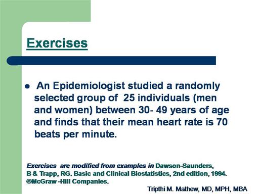 Now let’s do some exercises using the same data from normal distribution lecture, on heart rate as a guide. And we assume that heart rate (PR) is a normally distributed random variable with a known mean of 70 beats per minute and a standard deviation of 10 in the population of normal healthy individuals (adults). Please attempt the next 3 exercises on your own before looking at the solutions in the near end. |