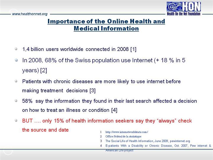 The numbers concerning Internet use continue to grow. It seems like everyone is using it and actually, 4 billion today, 665 millions just few month ago there are just some special segments of the population who are not using it – Internet has joined the mainstream media. For popular health search terms, hundreds of million of web pages are quickly available through the popular search engines. Concerning health 2.0 resources, already 46 million results for the search term “health blog”.