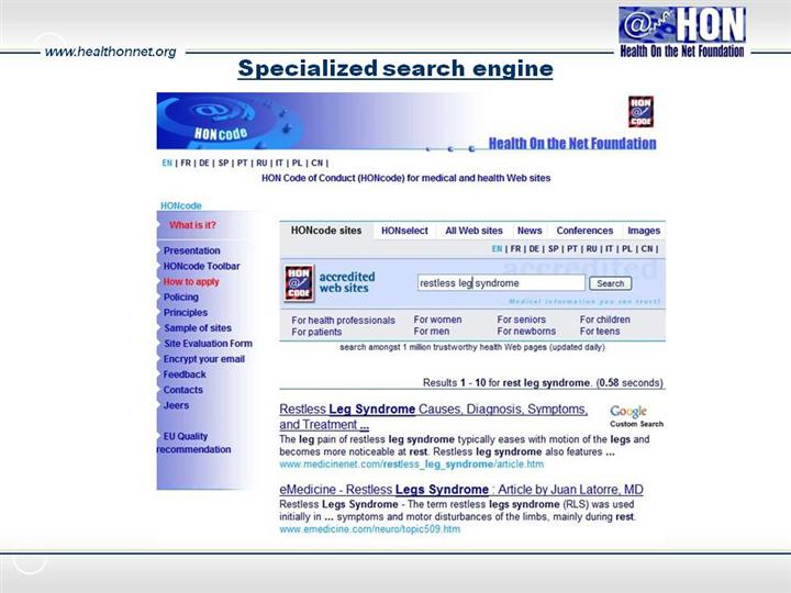 The results will be selected from amongst HONcode-accredited sites and the search can be refined according to the user profile |